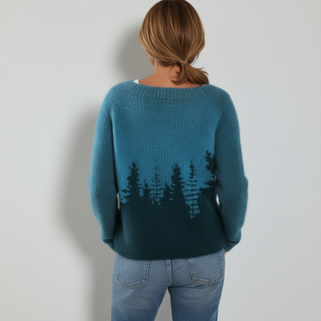 The Diane Sweater blends natural serenity with everyday comfort. With a soft blue wool blend and a shadowed silhouette of pine trees stretching across the lower chest, this design evokes calm winter walks and mountain escapes — right from your wardrobe.