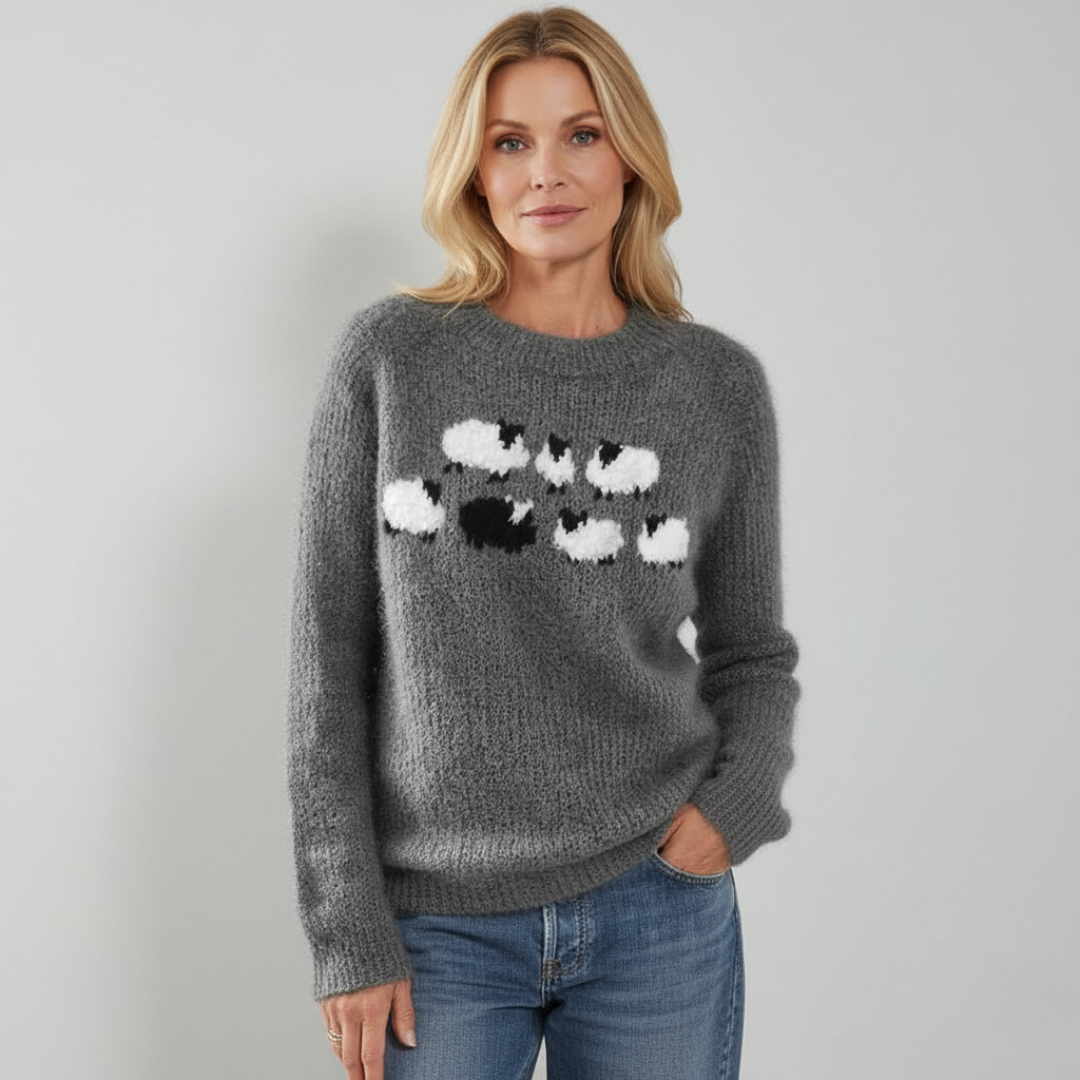 The Vivian sweater is soft and charming, adding a touch of Icelandic countryside fun to everyday wear. Its playful sheep pattern and premium fabric create a warm embrace on a chilly morning. Crafted from a blended fabric, this sweater offers comfort, warmth, and personality, making it an ideal choice for those seeking effortless fashion.