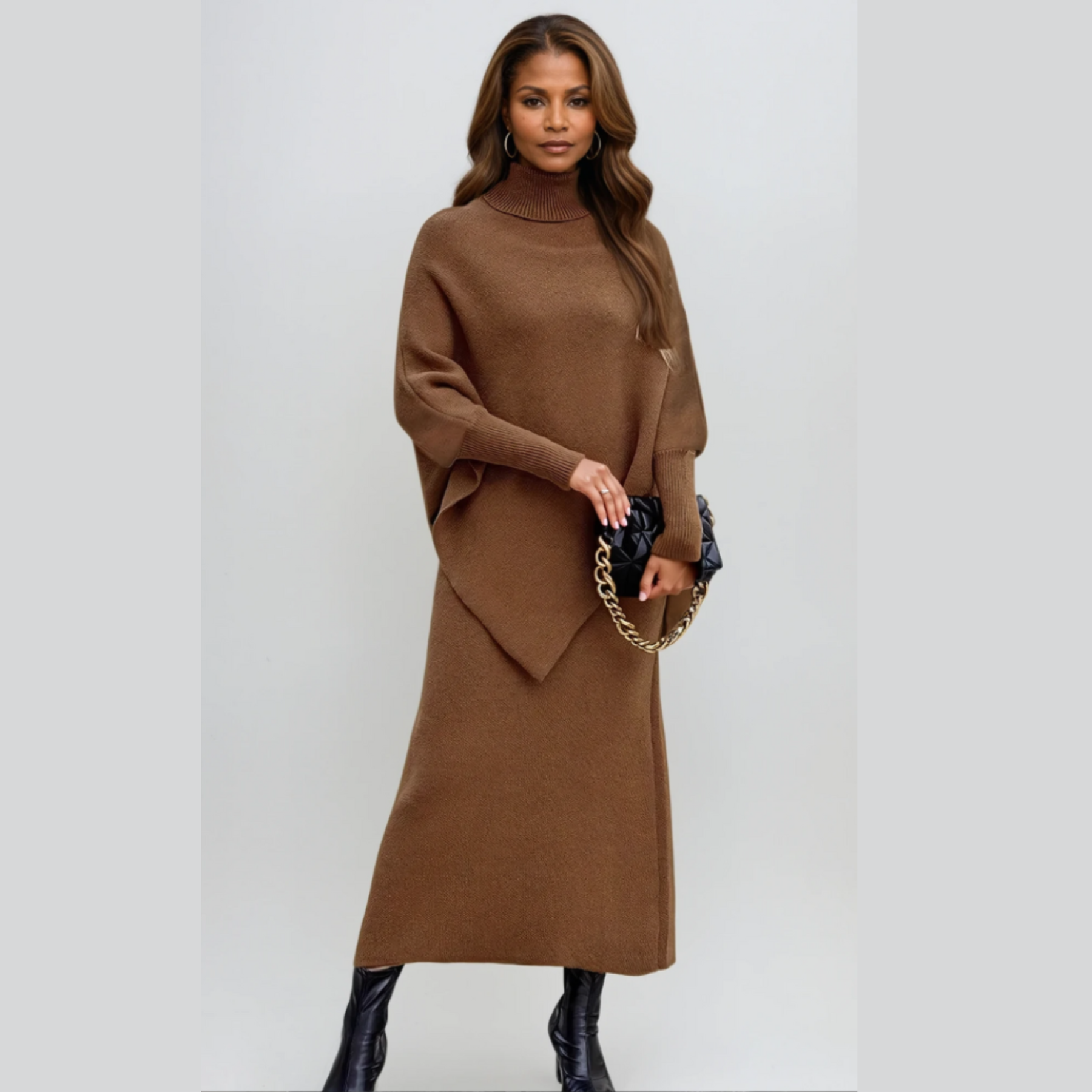 Elevate your everyday elegance with the Amelia Knit Set — a two-piece ensemble designed for women who value timeless style and effortless comfort. The soft knit turtleneck poncho drapes gracefully over the matching midi skirt, creating a flattering silhouette that moves with ease. Perfectly versatile, Amelia transitions seamlessly from daytime errands to evening gatherings with friends. Pair with sleek boots and a statement bag for a polished look that feels as good as it looks.