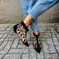 This ankle boot combines a bold leopard print with contrasting black finishes for a look that stands out. The pointed toe adds elegance, while the low sole makes it perfect for everyday wear.
