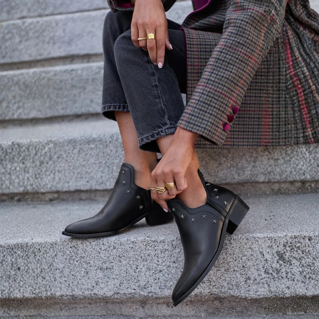 This pointed ankle boot with mini star details adds character and originality to every step. Perfect for those who love to stand out with a bold and sophisticated style.