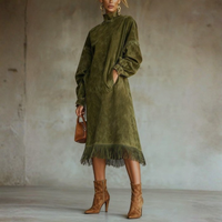 The Talia | Suede Fringe Dress brings bold sophistication with a playful edge. Crafted in a smooth suede-feel fabric, it features a refined high neckline, dramatic puff sleeves, and a flowing fringe hem that sways gracefully with every step. A relaxed, flattering fit makes it easy to wear while creating a striking, modern silhouette — perfect for evenings out, gallery moments, and occasions that deserve something extraordinary.