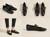 The Amelia flats feature a sleek almond toe and a soft, structured finish with two delicate silver buckles — adding a modern twist to a timeless classic.