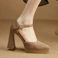 The Clara Pumps combine refined height with secure footing, offering a blend of timeless charm and reliable comfort. Featuring a rounded toe, adjustable ankle strap, and a balanced block heel with platform, these heels flatter the foot while supporting it. Ideal for celebrations or chic everyday wear, Clara brings elegance to every step.