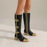 Stride boldly in boots that blend sleek premium faux leather, golden accents, and equestrian-inspired details. Designed for comfort and unmistakable presence, they’re your go-to for commanding every step of your day.