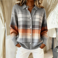 The Uma blouse combines a calm base of light and dark gray with warm accents in off-white and orange. The gentle check pattern runs evenly across the entire design, giving it a balanced, modern appeal. The wood-look buttons and classic collar make the design timeless and easy to style.